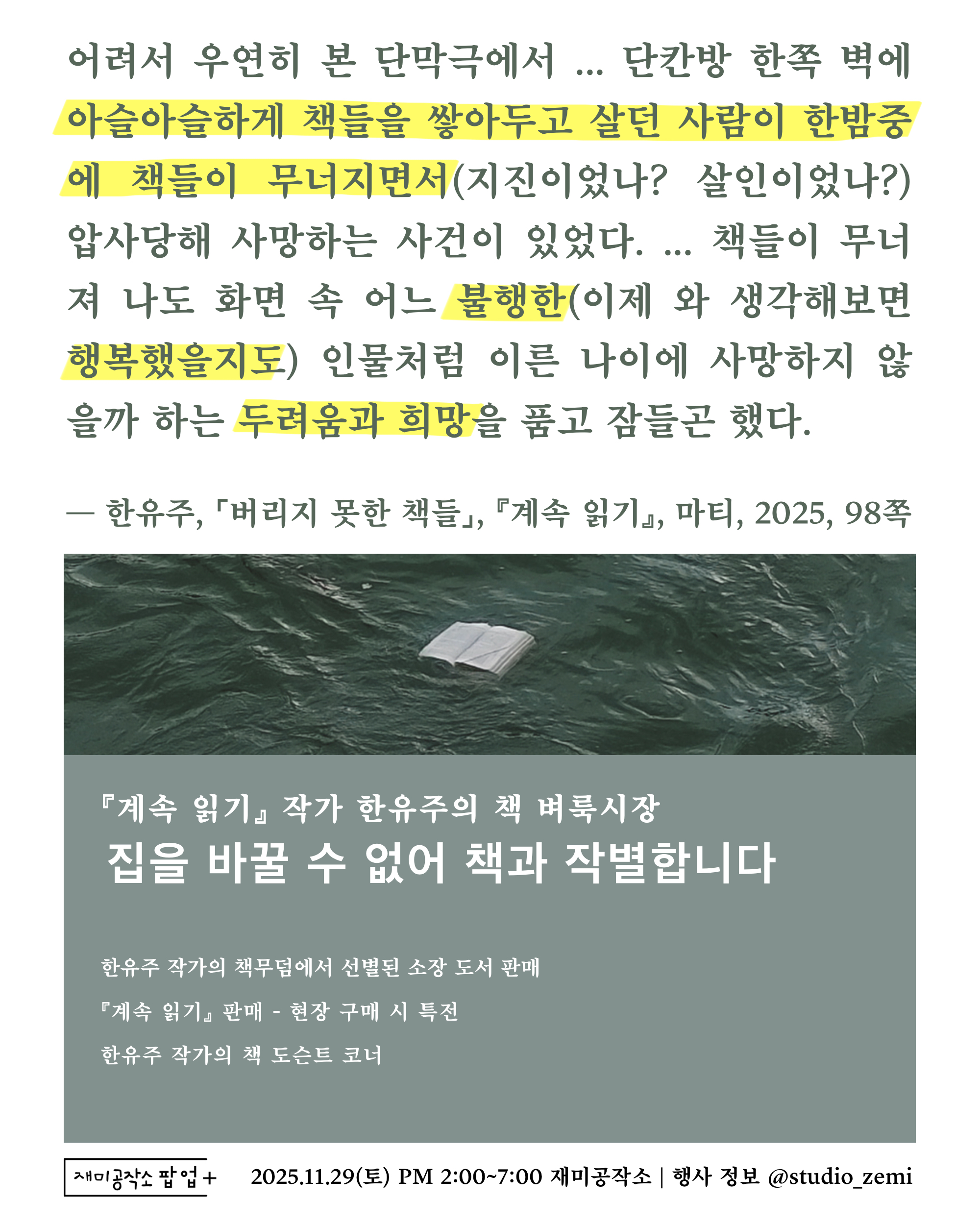 [재미공작소 팝업+] 『계속 읽기』 소설가 한유주의 책 벼룩시장 <집을 바꿀 수 없어 책과 작별합니다> 2025.11.29.(토)