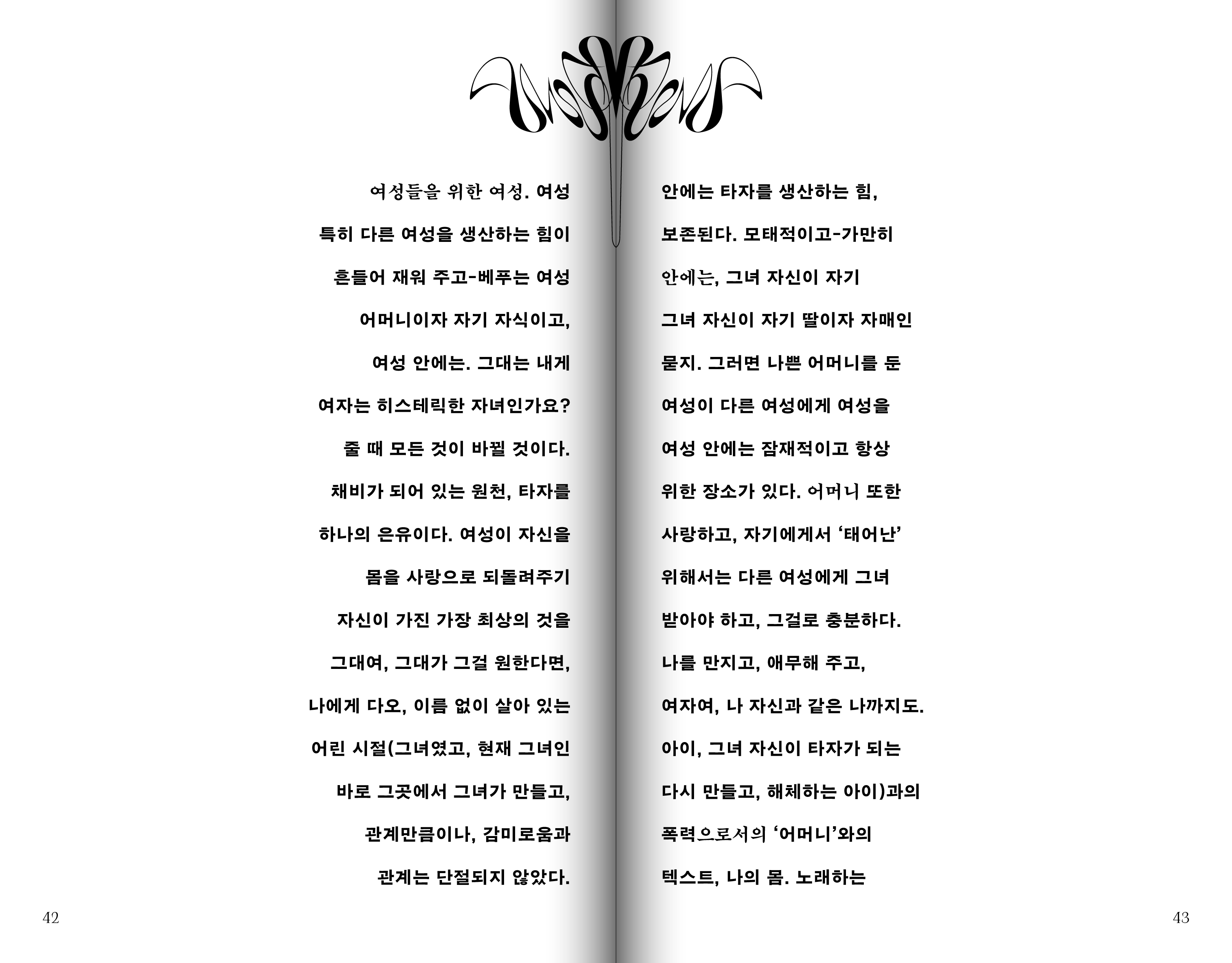 (ㅎ..하하😂) 책이 제본되고 제작이 완료돼야 이 본문 레이아웃이 실제 어떻게 구현될지 알 수 있을 텐데요. 교정을 보면서 선명히 느낀 것은 지금의 형식으로 읽고 경험하는 「메두사의 웃음」 그리고 「장미 가시 효과」 특유의 문투가 더 강렬하게 다가온다는 점이에요. 치고 들어오는 이미지, 폭발적인 정념의 발화, 반향하는 몸의 리듬이 기존의 개념과 상징과 서사를 휘어감고 부수고 새롭게 만드는 과정이 좀 더 생생히 느껴진다 할까요?! 네네 ‘일러두기’에서보다 느끼한 말을 더 하기 전에 이만 줄이겠습니다…….