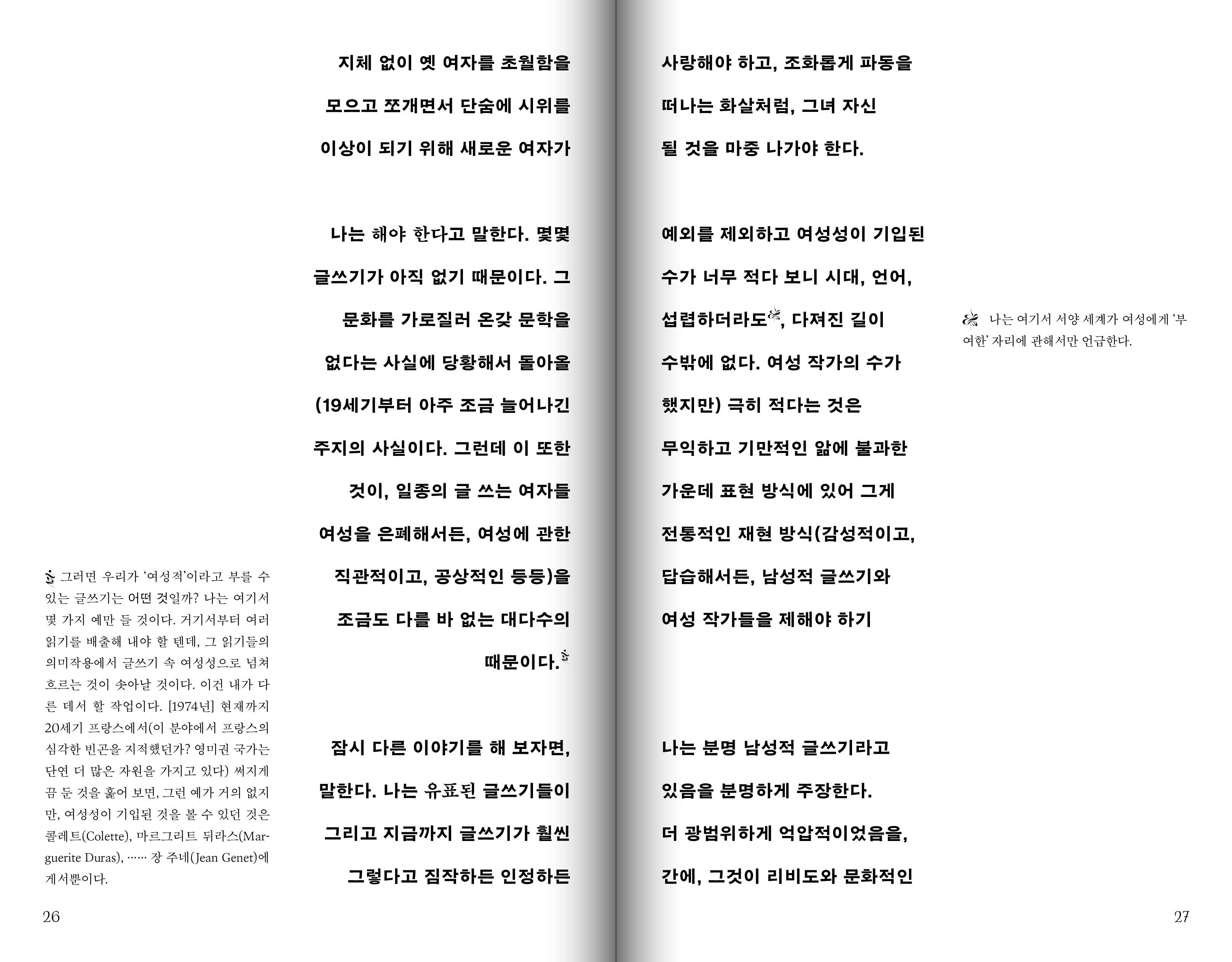 이 책의 디자인을 맡아준 김동신 디자이너와 콘셉트 회의 때 나눈 이야기 중 하나가 본문 레이아웃을 실험적으로 가도 좋을 듯싶다는 것이었어요. 앞서 불문학 연구자 이혜인 번역가와 ‘잘 읽히지 않는’ 문체, 낯선 표현을 무조건 매끄럽게 다듬어 ‘가독성’을 높이려는 수정은 「메두사의 웃음」이라는 글과 맞지 않는 것 같다는 이야기를 하며 편집 방향을 잡았고요. 강력한 정념과 은유가 사유를 추동하는 글쓰기에, 그것을 강조하는 형태를 부여해도 좋겠다고 느꼈기 때문이었습니다.