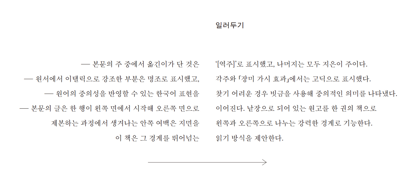 글의 한 행이 왼쪽 면에서 시작해 오른쪽 면으로 이어지는 콘셉트입니다. 책을 펼치면 골처럼 나타나는 제본 영역을 건너뛰어 문장이 이어지는 것이지요. 편집을 하다 보니 책에 문제가 있다는 항의 전화가 빗발치는 상(망)상이 들면서…… ‘일러두기’에 이에 대한 설명을 넣어야겠다 싶었습니다. 한데 어떻게 써야 할지가 상당히 고민됐어요.